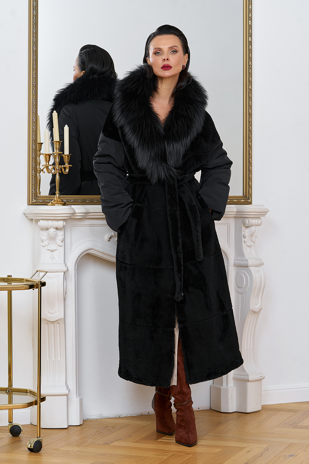 Вид застежки - кнопки, пояс из меха овчины